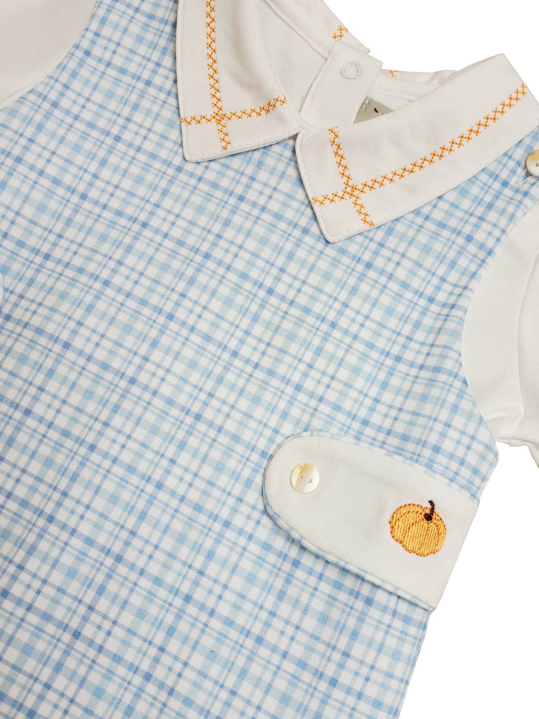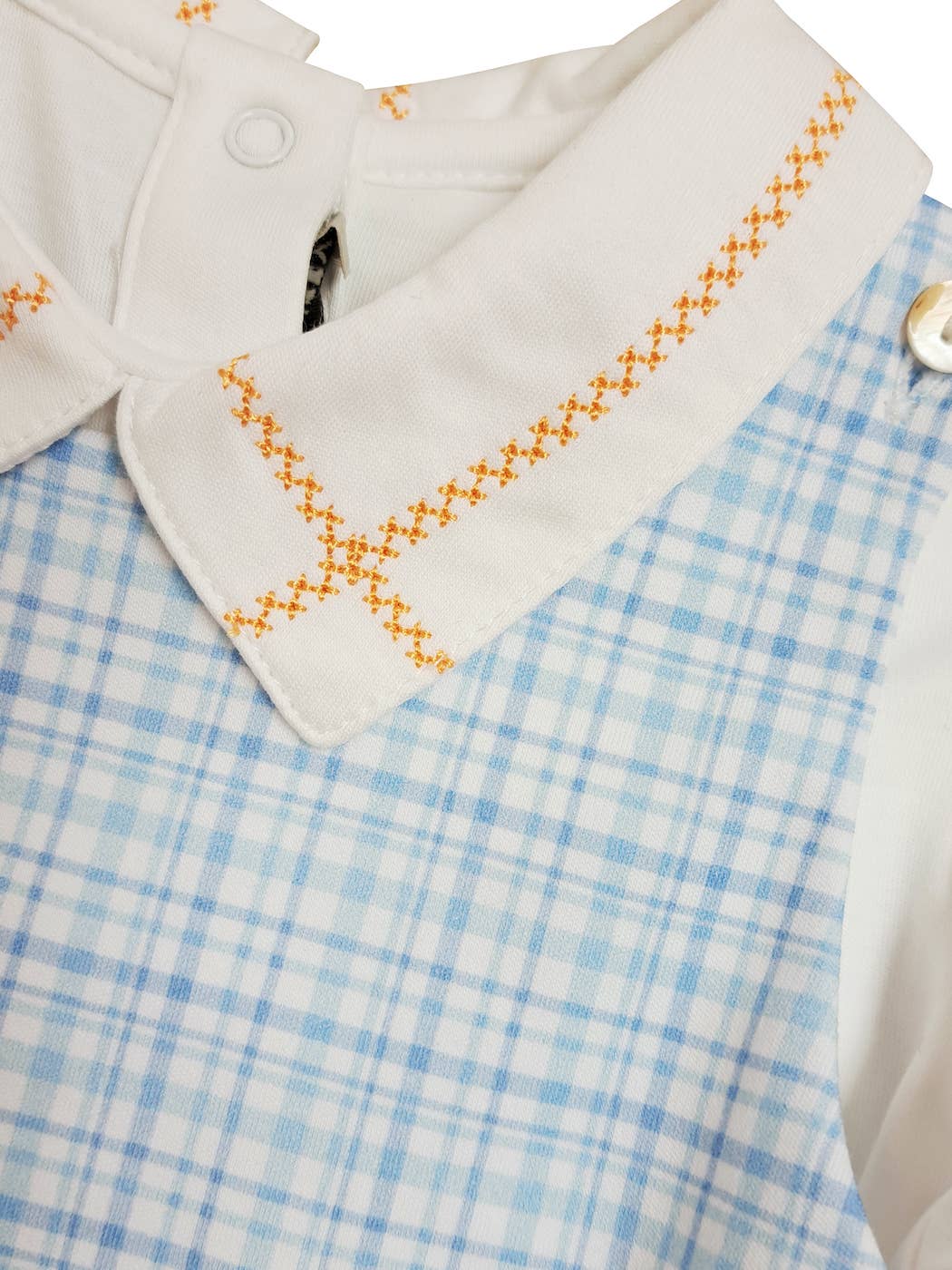 Pumpkin Collection. Two-piece light blue plaid set. White top and light blue plaid shortall with tabs on the sides. 100% soft Pima cotton. Made in Peru.