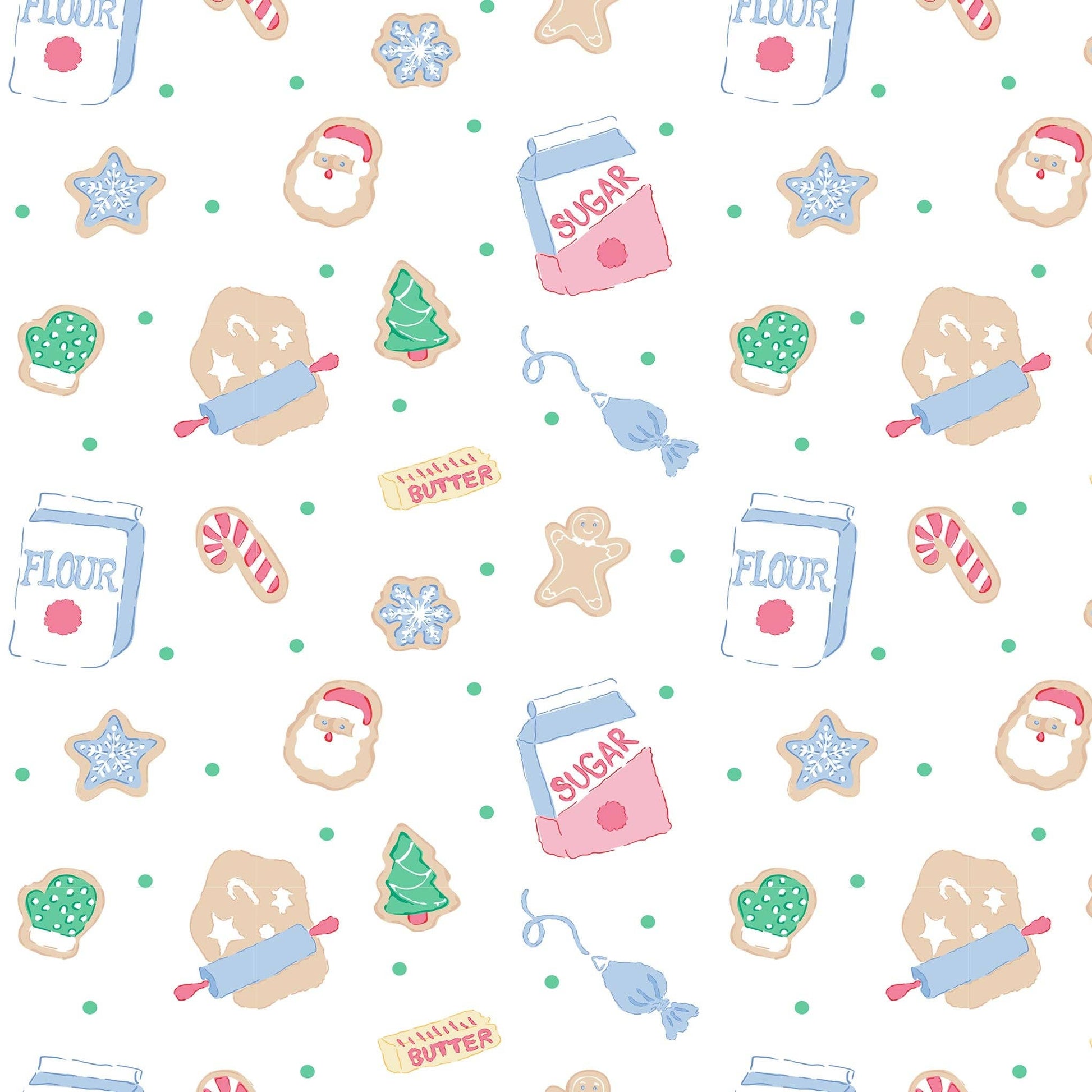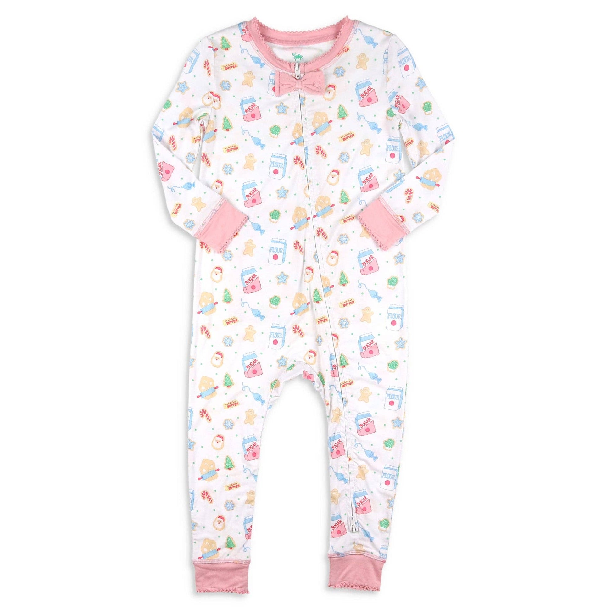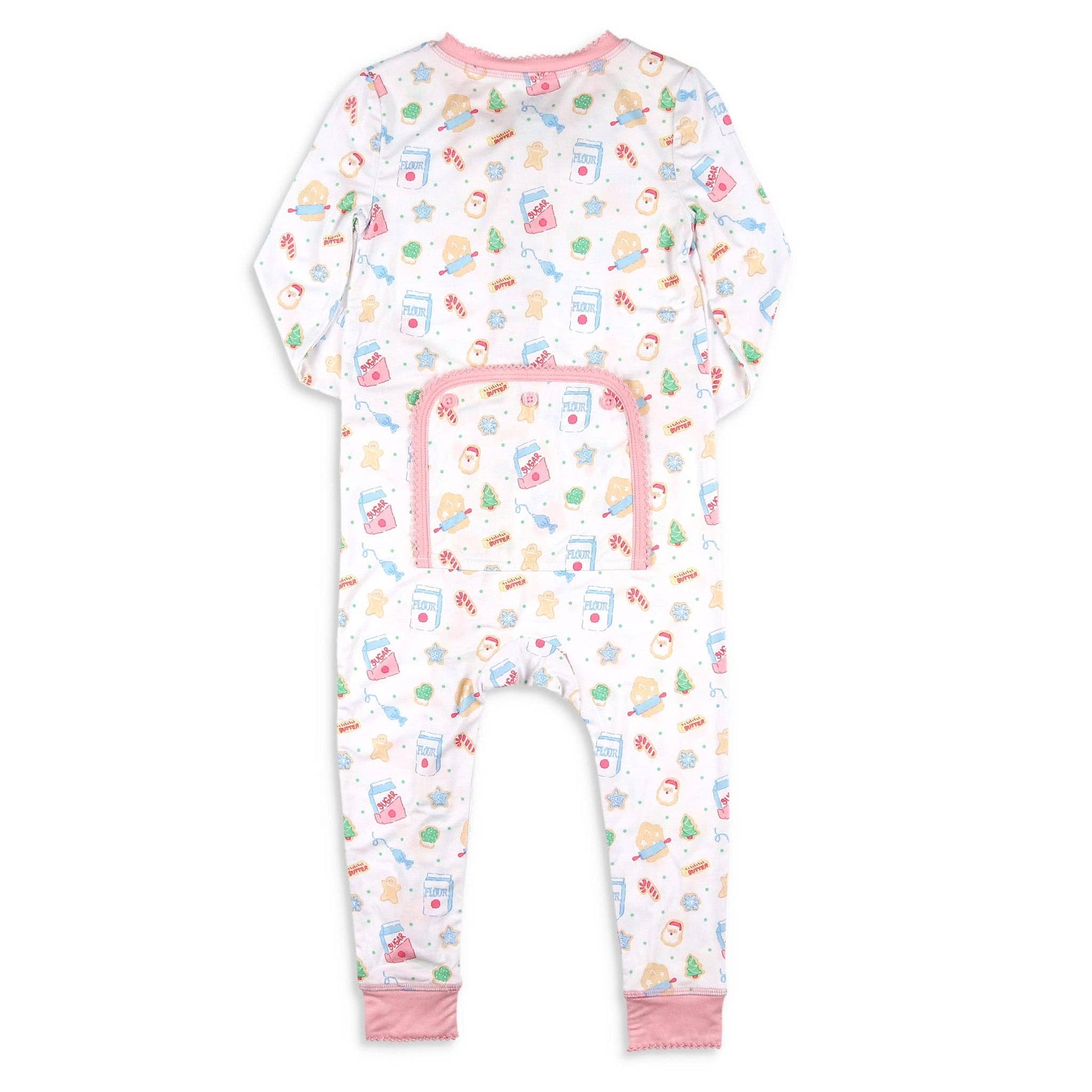 It's the favorite time of year to be in the kitchen! This adorable Pink Bamboo Onesie-Cookie Crew brings Christmas wonder to baking and bedtime with all the ingredients for baking Christmas Cookies, along with iced cookies, printed on soft white bamboo fabric. The picot trimmed pink banded neckline, the pink snap placket topped with a pick bow, the pink sleeve cuffs and leg cuffs, and pink trimming the nonfunctioning back flap, all make this onesie a picture of innocence!