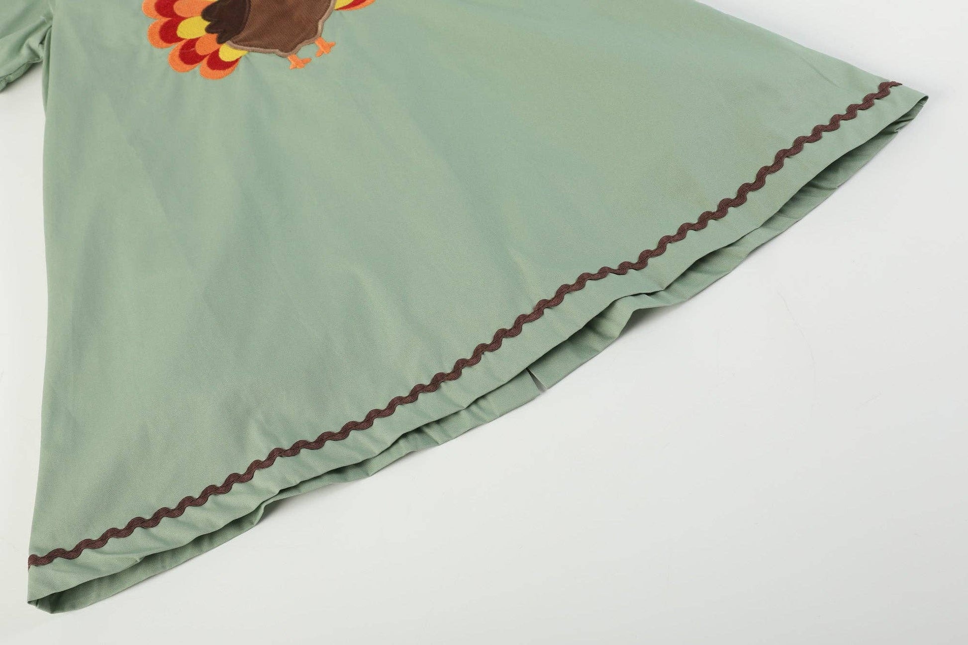 Gobble up the cuteness with our Sage Green Turkey Collared Dress! Adorned with an adorable appliqué turkey, this dress is a festive delight for Thanksgiving celebrations. In charming sage green, it's the perfect outfit for your little one to strut into the holiday season with a dash of Thanksgiving charm.